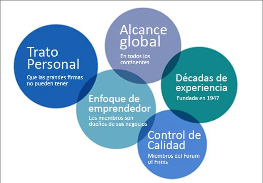 Los socios de las firmas miembro de MGI Worldwide cuidan personalmente de tus clientes. En la red construimos amistades cercanas entre nosotros basadas en la lealtad, el respeto y la experiencia compartida. Ofrecemos el toque personal que no se encuentra en las grandes firmas.